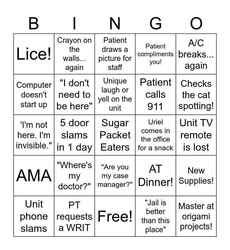 This bingo card has 25 words: AMA, PT requests a WRIT, Sugar Packet Eaters, "Jail is better than this place", A/C breaks... again, Lice!, Crayon on the walls... again, Patient draws a picture for staff, Uriel comes in the office for a snack, New Supplies!, Computer doesn't start up, "I don't need to be here", Free!, AT Dinner!, Checks the cat spotting!, Unit phone slams, 5 door slams in 1 day, Unique laugh or yell on the unit, Patient calls 911, Unit TV remote is lost, 'I'm not here. I'm invisible.", "Where's my doctor?", "Are you my case manager?", Patient compliments you! and Master at origami projects!.