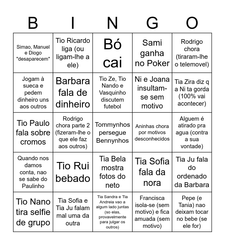 This bingo card has a free space and 24 words: Tio Rui bebado, Tia Sofia e Tia Ju falam mal uma da outra, Tio Ze, Tio Nando e Vasquinho discutem futebol, Tio Nano tira selfie de grupo, Rodrigo chora (tiraram-lhe o telemovel), Simao, Manuel e Diogo "desaparecem", Jogam à sueca e pedem dinheiro uns aos outros, Tio Ricardo liga (ou ligam-lhe a ele), Aninhas chora por motivos desconhecidos, Tia Bela mostra fotos do neto, Ni e Joana insultam-se sem motivo, Tio Paulo fala sobre cromos, Tia Sofia fala da nora, Tia Ju fala do ordenado da Barbara, Barbara fala de dinheiro, Francisca isola-se (sem motivo) e fica amuada (sem motivo), Alguem é atirado pra agua (contra a sua vontade), Bó cai, Tia Zira diz q a Ni ta gorda (100% vai acontecer), Rodrigo chora parte 2 (fizeram-lhe o que ele faz aos outros), Pepe (e Tania) nao deixam tocar no bebe (se ele for), Quando nos damos conta, nao se sabe do Paulinho, Sami ganha no Poker and Tia Sandra e Tia Andreia vao a algum lado juntas (so elas, provavelmente para julgar os outros).