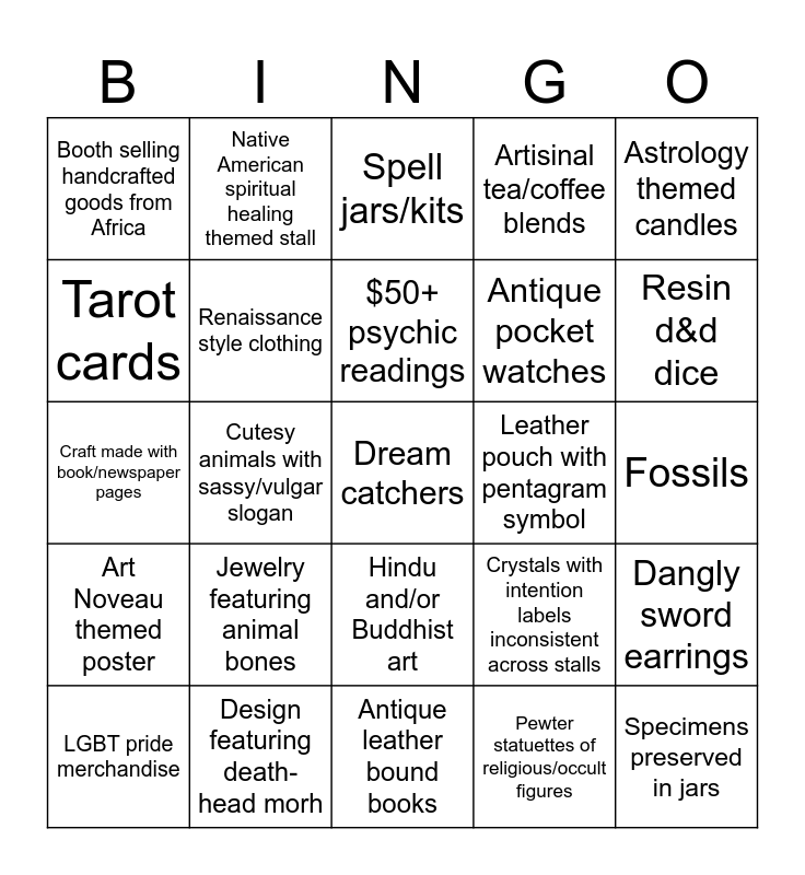 This bingo card has a free space and 49 words: Porcelain antique dolls, Specimens preserved in jars, Framed dead insects, Antique leather bound books, Jewelry featuring animal bones, Horror themed prints, Native American spiritual healing themed stall, Witch-themed item featuring the word "patriarchy", Tarot cards, Botanical posters, Renaissance style clothing, Artisinal tea/coffee blends, Dangly sword earrings, Crystals with intention labels inconsistent across stalls, Gourmet vegan food, Flash tattoos, $50+ psychic readings, Leather pouch with pentagram symbol, Perfume titled "dragon's blood" or "frankincense & myrrh", Astrology themed candles, Cutesy animals with sassy/vulgar slogan, Pewter statuettes of religious/occult figures, Booth selling handcrafted goods from Africa, Antique pocket watches, Daggers/knives, Resin d&d dice, LGBT pride merchandise, Coffin shaped trinket box, Hindu and/or Buddhist art, Art Noveau themed poster, Leather chokers & bracelets, Handcrafted aromatherapy soaps, Plague doctor mask, Woodcut style posters featuring circuses & skeletons, Design featuring death-head morh, Phrenology bust, Taxidermied animal with two heads, Steampunk themed stall, Fossils, Hand-made roach clips or pipes, Anti-Trump merchandise, Mushroom with woman's body/legs art, 3D printed trinkets, Ignored horror/fantasy book author, Craft made with book/newspaper pages, Spell jars/kits, Mood rings, Quill/fountain pens & ink and Merch featuring the word "absinthe".