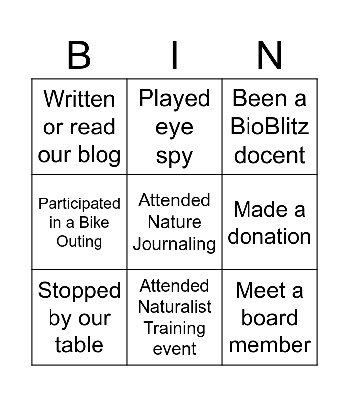 This bingo card has 15 words: Free!, Attend a BioBlitz, Been a BioBlitz docent, Written or read our blog, Attended Naturalist Training event, Attended Nature Journaling, Participated in a Cleanup, Helped at a Restoration event, Made a donation, Meet a board member, Meet a staff member, Participated in a Bike Outing, Stopped by our table, Played eye spy and Planted trees.