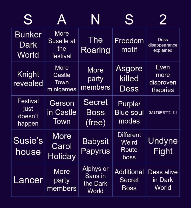 This bingo card has a free space and 24 words: Lancer, More Carol Holiday, More party members, Additional Secret Boss, Dess disappearance explained, Bunker Dark World, More Suselle at the festival, The Roaring, Purple/ Blue soul modes, GASTER?!???!!1!1, Festival just doesn’t happen, More Castle Town minigames, Different Weird Route boss, Undyne Fight, Knight revealed, More party members, Alphys or Sans in the Dark World, Freedom motif, Even more disproven theories, Susie’s house, Gerson in Castle Town, Babysit Papyrus, Asgore killed Dess and Dess alive in Dark World.
