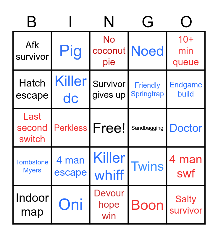 This bingo card has a free space and 28 words: 4 man swf, 3 survivor dc, Friendly Springtrap, Boon, Hatch escape, No coconut pie, Pig, Tombstone Myers, Sandbagging, Indoor map, Last second switch, Noed, Oni, Devour hope win, Endgame build, Outdoor map, 4 man escape, Killer dc, Survivor gives up, Killer whiff, Afk survivor, M1 only, Salty survivor, Perkless, Doctor, Twins, 10+ min queue and Slugging.