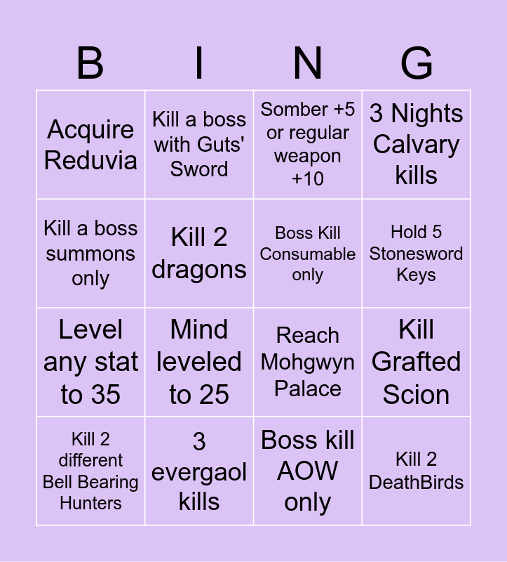 This bingo card has 30 words: Kill Margit, Kill Tree Sentinel, Kill Grafted Scion, Kill Godrick, Acquire Reduvia, Somber +5 or regular weapon +10, Boss Kill Consumable only, Sit at a grace in Altus Plateau, 3 evergaol kills, Acquire Both halves of Dectus Medallion, Boss kill AOW only, Kill 2 different Bell Bearing Hunters, Make it to Ijji, Kill 2 different Erdtree Avatars, Mind leveled to 25, Acquire 4 throwing pot types, Holding >60k Runes, Kill 2 DeathBirds, Obtain a full armor set (4 pieces), Kill a boss summons only, Reach Mohgwyn Palace, Get abducted, Kill a boss with Guts' Sword, Level any stat to 35, Kill 2 dragons, 3 Nights Calvary kills, Die From a status ailment, Boss kill Bow only, Hold 5 Stonesword Keys and Respec your character.