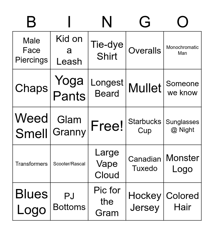 This bingo card has a free space and 32 words: Hockey Jersey, Socks & Sandles, Glam Granny, Nose Picker, Transformers, Yoga Pants, Monochromatic Man, Monster Logo, Kid on a Leash, The "10" Couple, Longest Beard, Tie-dye Shirt, Teenage Mutant Ninja Turtle, She Shouldn't Wear That, Starbucks Cup, Man Bun, Blues Logo, Weed Smell, Large Vape Cloud, Scooter/Rascal, Canadian Tuxedo, Cut Off Sleeves, Sunglasses @ Night, PJ Bottoms, Colored Hair, Overalls, Mullet, Chaps, Male Face Piercings, Pic for the Gram, Crying Baby and Someone we know.