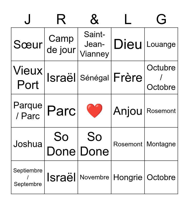 ⚠ This card has duplicate items: Gianella (2), So Done (2), Joshua (2), Vieux Port (2), Israël (2), Rosemont (2), Sénégal (2), Anjou (2), Saint-Jean-Vianney (2)