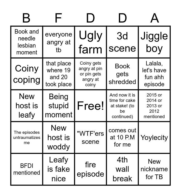 This bingo card has a free space and 24 words: New host is woddy, Leafy is fake nice, Coiny gets angry at pin or pin gets angry at coiny, BFDI mentioned, Jiggle boy, Book and needle lesbian moment, Coiny coping, everyone angry at tb, And now it is time for cake at stake! (to be continued), "WTF'ers scene, Book gets shredded, New host is leafy, comes out at 10 P.M for me, Yoylecity, that place where 19 and 20 took place, 4th wall break, 2015 or 2014 or 2013 or 2012 mentioned, Ugly farm, Lalala, let's have fun ahh episode, Being stupid moment, New nickname for TB, The episodes untraumatizes me, 3d scene and fire episode.