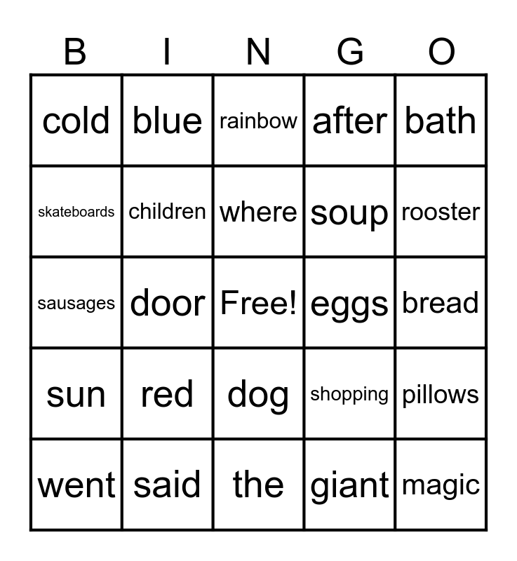 This bingo card has a free space and 52 words: rain, magic, violet, the, red, orange, blue, computer, skateboards, machine, children, sleep, pillows, shopping, carrots, cart, where, eggs, onions, bath, door, giant, cold, soup, path, steps, mouse, road, rooster, farmer, traffic, after, horse, yellow, woman, rainbow, said, ball, comes, played, put, bread, sun, stop, dog, speeding, baby, sausages, strawberries, here, went and out.