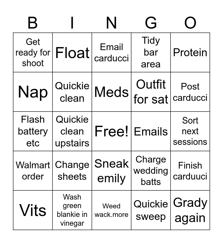 This bingo card has a free space and 24 words: Change sheets, Wash green blankie in vinegar, Meds, Vits, Protein, Get ready for shoot, Nap, Float, Emails, Sneak emily, Outfit for sat, Flash battery etc, Charge wedding batts, Finish carduuci, Quickie clean, Quickie sweep, Sort next sessions, Email carducci, Post carducci, Quickie clean upstairs, Grady again, Walmart order, Tidy bar area and Weed wack.more.