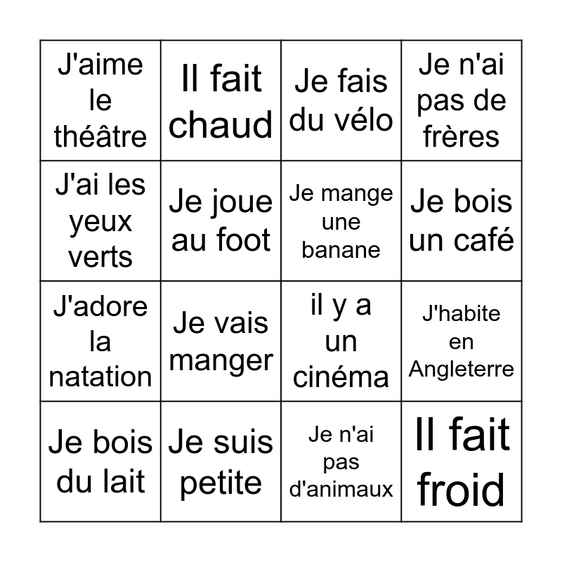 This bingo card has 28 words: J'ai un lapin, J'ai un chien, J'adore la natation, Je déteste les maths, Je joue au foot, Je fais du vélo, Il fait chaud, Il fait froid, Je suis petite, il y a une piscine, il y a un cinéma, Je n'ai pas de frères, Je voudrais avoir un chat, Je vais visiter, Je vais manger, Nous allons jouer, Je n'aime pas l'histoire, Je mange une banane, Je bois un café, J'écoute de la musique, J'aime le théâtre, Je mange du pain, Je bois du lait, J'habite en Angleterre, Je n'ai pas d'animaux, J'habite dans une ville, J'ai les yeux verts and J'ai les cheveux bruns.