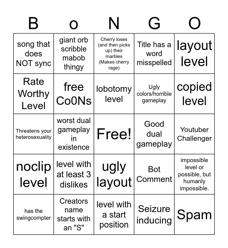 This bingo card has a free space and 24 words: level with at least 3 dislikes, Creators name starts with an "S", lobotomy level, has the swingcompter, layout level, song that does NOT sync, Rate Worthy Level, giant orb scribble mabob thingy, Good dual gameplay, ugly layout, Ugly colors/horrible gameplay, Threatens your heterosexuality, Bot Comment, impossible level or possible, but humanly impossible., free Co0Ns, Seizure inducing, Youtuber Challenger, Cherry loses (and then picks up) their marbles (Makes cherry rage), copied level, worst dual gameplay in existence, Spam, noclip level, Title has a word misspelled and level with a start position.