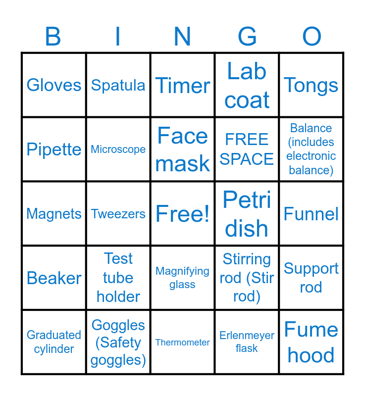 This bingo card has a free space and 25 words: Beaker, Test tube, Funnel, Goggles (Safety goggles), Lab coat, Gloves, Timer, Tongs, Tweezers, Stirring rod (Stir rod), Pipette, Face mask, Fume hood, Test tube holder, FREE SPACE, Graduated cylinder, Thermometer, Balance (includes electronic balance), Microscope, Petri dish, Magnets, Magnifying glass, Support rod, Spatula and Erlenmeyer flask.