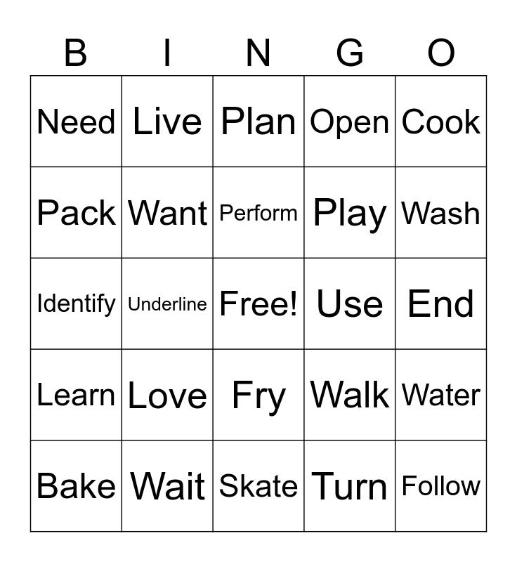 This bingo card has a free space and 25 words: Love, Skate, Perform, Bake, Cook, Need, Pack, Live, Use, Fry, Play, Identify, Walk, Water, Want, Enjoy, End, Plan, Wash, Underline, Follow, Wait, Learn, Open and Turn.