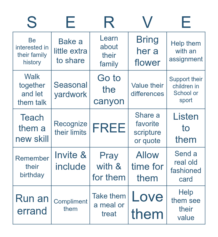 This bingo card has a free space and 29 words: Run an errand, Ask them to teach you something, Recognize their limits, Help them move, Be interested in their family history, Learn about their family, Seasonal yardwork, Invite & include, Share a favorite scripture or quote, Compliment them, Listen to them, Help them see their value, Take them a meal or treat, Love them, Support their children in School or sport, Sit with them at church/activity, Pray with & for them, Remember their birthday, Help them with an assignment, Teach them a new skill, Allow time for them, Keep confidences, Value their differences, Walk together and let them talk, Bring her a flower, Bake a little extra to share, Send a real old fashioned card, Go to the canyon and Go on a walk..