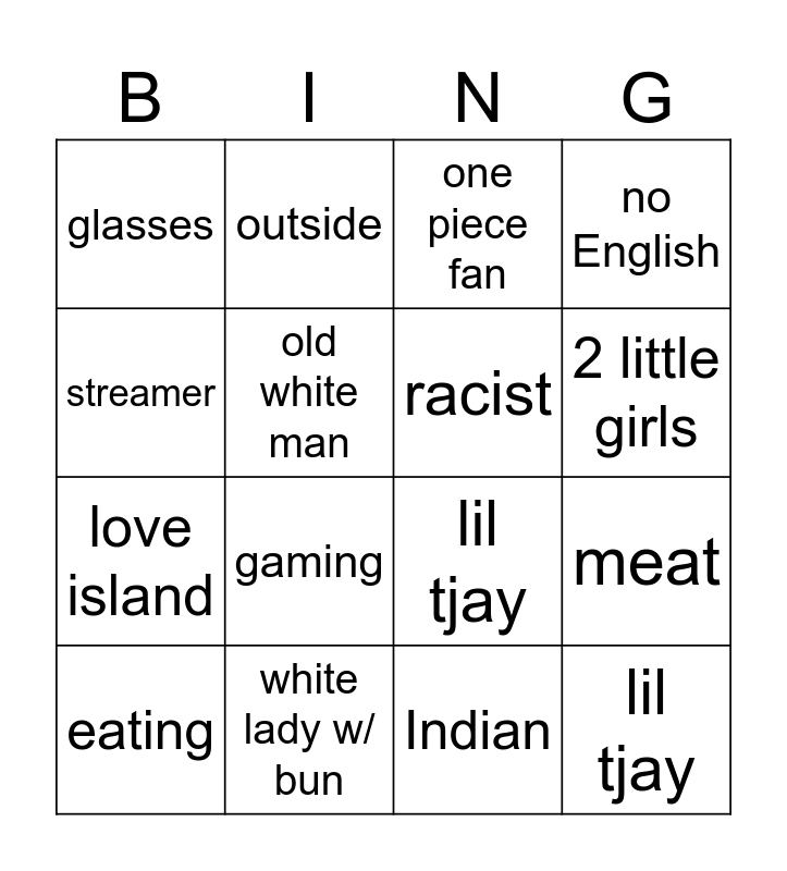 This bingo card has 17 words: Indian, eating, one piece fan, glasses, gaming, no English, meat, racist, 2 little girls, old white man, white lady w/ bun, lil tjay, streamer, outside, love island, black screen and lil tjay.