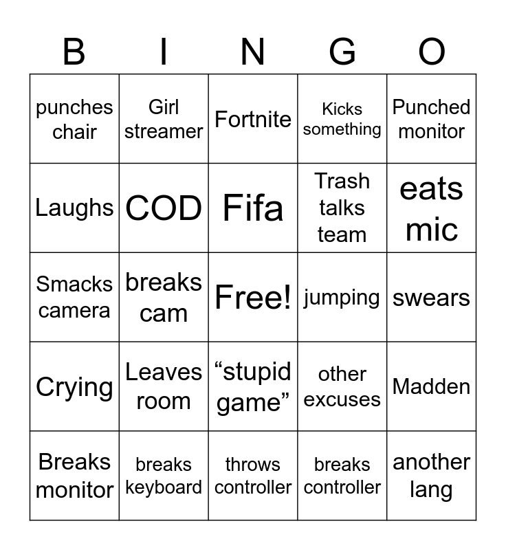 This bingo card has a free space and 29 words: Breaks monitor, disconnects camera, breaks cam, yells, punches chair, Fortnite, COD, Leaves room, jumping, breaks keyboard, swears, another lang, throws controller, breaks controller, eats mic, blaming lag, “stupid game”, Crying, Punched monitor, Smacks camera, other excuses, Red in the face, Trash talks team, Laughs, Kicks something, Girl streamer, Madden, Fifa and Minecraft.