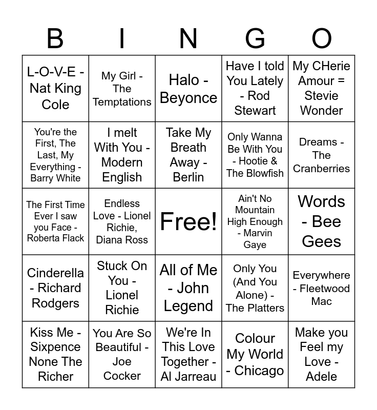 This bingo card has a free space and 75 words: Let's Get it on - Marvin Gaye, At Last - Etta James, Halo - Beyonce, Lover - Taylor Swift, Wonderful Tonight - Eric Clapton, Iris - The Goo Goo Dolls, Can't Help Falling in Love - Elvis Presley, (Everything I do - I do it For You - Bryan Adams, Truly Madly Deeply - Savage Garden, Eternal Flame - The Bangles, Can you feel the Love Tonight - Elton John, I have Nothing - Whitney Houston, Take My Breath Away - Berlin, You're the First, The Last, My Everything - Barry White, I say A Little Prayer - Aretha Franklin, Endless Love - Lionel Richie, Diana Ross, You're Still The One - Shania Twain, Make you Feel my Love - Adele, Always and Forever - Heatwave, My CHerie Amour = Stevie Wonder, Crazy Little Thing Called Love - Queen, The First Time Ever I saw you Face - Roberta Flack, I melt With You - Modern English, My Girl - The Temptations, Have I told You Lately - Rod Stewart, I choose You - Sara Bareilles, You Make me feel Brand New - The Stylistics, Perfect - Ed Sheeran, Longer - Dan Fogelberg, I'll Be There - The Jackson 5, Have I told You Lately - Van Morrison, Marry Me - Train, I walk The Line - Johnny Cash, Only You (And You Alone) - The Platters, Dreams - The Cranberries, Only Wanna Be With You - Hootie & The Blowfish, She - Elvis Costello, More - Nat King Cole, Words - Bee Gees, Colour My World - Chicago, If - Bread, How Sweet It Is (To Be Loved By You) - James Taylor, Nothing's Gonna Stop us Now - Starship, Then Came You - The Spinners, Everlasting Love - Carl Carlton, Accidentally In Love - Counting Crows, Kiss Me - Sixpence None The Richer, L-O-V-E - Nat King Cole, Chasing Cars - Snow Patrol, Love Story - Taylor Swift, I'm Yours - Jason Mraz, All of Me - John Legend, You Always Make Me Smile - Kyle Andrews, Rhythm Of Love - Playin White T's, You're My Best Friend - Queen, This Will Be (An Everlasting Love) - Natalie Cole, Happy Together - The Turtles, So This is Love - Ilene Woods, Kiss The Girl - Samuel E Wright, Can't Take My Eyes Off You - Frankie Valli, Stuck On You - Lionel Richie, Loving You Easy - Zac Brown Band, Annie's Song - John Denver, Never Gonna Give You Up - Rick Astley, So Much in Love -Timothy B. Schmit, Ain't No Mountain High Enough - Marvin Gaye, You Make My Dreams ( Come True) - Daryl Hall & John Oates, (Your Love Keeps Lifting Me) Higher and Higher - Jackie Wilson, You Make Loving Fun - Fleetwood Mac, Everywhere - Fleetwood Mac, Cinderella - Richard Rodgers, You Are So Beautiful - Joe Cocker, A Thousand Years - Christina Perri, We're In This Love Together - Al Jarreau and My Love - Paul McCartney.