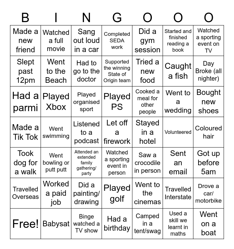 This bingo card has 49 words: Travelled Interstate, Caught a fish, Camped in a tent/swag, Went swimming, Played organised sport, Coloured hair, Watched a full movie, Binge watched a TV show, Started and finished reading a book, Watched a sporting event in person, Watched a sporting event on TV, Completed SEDA work, Went to a wedding, Cooked a meal for other people, Worked a paid job, Volunteered, Slept past 12pm, Day Broke (all nighter), Drove a car/ motorbike, Did a gym session, Tried a new food, Listened to a podcast, Made a new friend, Went to the Beach, Free!, Had to go to the doctor, Bought new shoes, Babysat, Played PS, Played Xbox, Went on a boat, Stayed in a hotel, Travelled Overseas, Did a painting/ drawing, Made a Tik Tok, Saw a crocodile in person, Sent an email, Got up before 5am, Had a parmi, Attended an extended family gathering/ party, Played golf, Took dog for a walk, Let off a firework, Had a birthday, Supported the winning State of Origin team, Sang out loud in a car, Went to the cinemas, Went bowling or putt putt and Used a skill we learnt in maths.