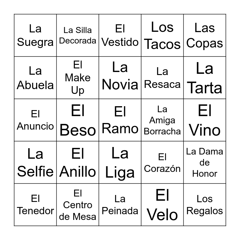 This bingo card has 42 words: Free!, La Novia, El Novio, El Anillo, El Velo, La Dama de Honor, El Ramo, Los Zapatos, El Vestido, La Liga, El Vino, La Tarta, El Beso, Las Copas, La Luna de Miel, El Corazón, Las Damas, El Anuncio, El Baile, La Silla Decorada, La Abuela, El Fotógrafo, Los Regalos, La Suegra, El Ex, La Cuñada, La Resaca, La Wedding Planner, La Decoración, La Tía Chismosa, El DJ, La Selfie, El Make Up, La Peinada, La Carcajada, El Tenedor, El Centro de Mesa, La Amiga Borracha, El Coche de Boda, El Anillo Perdido, Los Tacos and Los Biscochos.