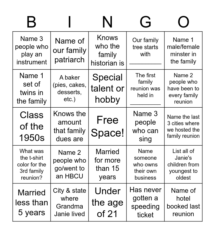 This bingo card has a free space and 69 words: Region that hosted the family reunion in 2009, Name the last 3 cities where we hosted the family reunion, Has children age 10 and/or under, Name 3 graduates this year, City & state where Grandma Janie lived, Name the comedian of the family, Our family tree starts with __________, Name 1 person who has lived overseas, Name 1 male/female minster in the family, Name 4 people who serve, or served, in the armed forces, List all of Janie's children from youngest to oldest, Has 3 generations represented at this year's reunion, Name 3 people who play an instrument, Knows who the family historian is, Name 2 family members who share a birthday month with you, Knows the amount that family dues are, Married for more than 15 years, The first family reunion was held in __________, Name an only child, What was the t-shirt color for the 3rd family reunion?, Name 3 people who can sing, Name someone who owns their own business, Name 2 people who have been to every family reunion, Name 3 of your third cousins, Name someone who shares your birth year, Knows the birth year of Janie Dais, Retired, A "Jack of all trades", Has never gotten a speeding ticket, Name 3 people who have more than 2 grandchildren, Name of our family patriarch, Name the "most seasoned" person at the reunion this year (oldest attendee), Name the "least seasoned" person at the reunion (youngest attendee), Has at least 3 siblings, Shares a name with a family ancestor, Name 3 people who are the youngest sibling, A grill master, Know and can name at least 5 people at the reunion, Name 1 set of twins in the family, Region with the largest number of members, Name 2 people who go/went to an HBCU, Name of hotel booked last reunion, Languages Grandma Janie spoke, Has at least one pet (name & type), Knows the 23rd Psalm, Married less than 5 years, Married more than 20 years, Has traveled outside of the United States, July birthday!, A baker (pies, cakes, desserts, etc.), Special talent or hobby, Is left handed, Wears glasses, Under the age of 21, Lived in at least 3 US States, Lived in at least 3 US Cities, Wearing red, List the last names of 3 family members at this reunion, Class of the 1980s, Class of the 1950s, Class of the 1960s, Class of the 1970s, Class of the 1990s, Class of the 2000s, Class of the 2010s, Class of the 2020s, Class of the 1940s, Speaks and/or knows more than 1 language and Plays or played an organized sport.