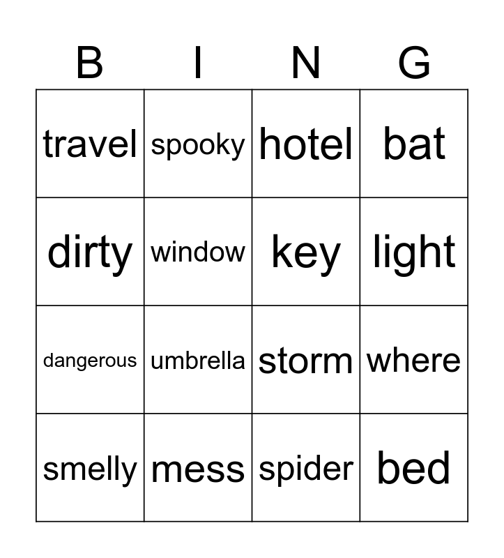 This bingo card has 20 words: where, sleep, hotel, rain, smelly, dirty, mess, travel, dangerous, spooky, umbrella, storm, window, bed, key, broken, light, bat, spider and web.