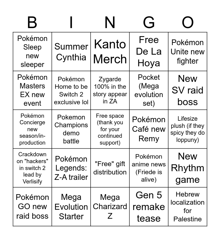 This bingo card has a free space and 24 words: Pokémon Legends: Z‑A trailer, Mega Evolution Starter, Zygarde 100% in the story appear in ZA, Pokémon GO new raid boss, Pokémon Unite new fighter, Pokémon Sleep new sleeper, Pokémon Masters EX new event, Summer Cynthia, Pokémon Café new Remy, "Free" gift distribution, Pocket (Mega evolution set), Pokémon Concierge new season/in-production, Pokémon anime news (Friede is alive), New Rhythm game, Pokémon Home to be Switch 2 exclusive lol, Gen 5 remake tease, Lifesize plush (if they spicy they do loppuny), Kanto Merch, New SV raid boss, Pokemon Champions demo battle, Hebrew localization for Palestine, Crackdown on "hackers" in switch 2 lead by Verlisify, Free De La Hoya and Mega Charizard Z.