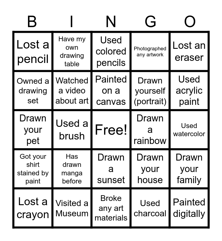 This bingo card has a free space and 24 words: Has drawn manga before, Visited a Museum, Painted on a canvas, Lost a crayon, Lost an eraser, Lost a pencil, Owned a drawing set, Have my own drawing table, Drawn a rainbow, Drawn a sunset, Drawn yourself (portrait), Drawn your pet, Drawn your house, Drawn your family, Watched a video about art, Used charcoal, Used watercolor, Used colored pencils, Used acrylic paint, Used a brush, Painted digitally, Got your shirt stained by paint, Photographed any artwork and Broke any art materials.