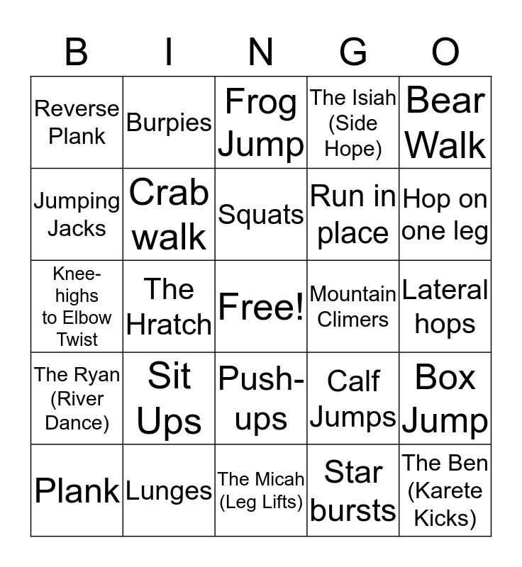 This bingo card has a free space and 24 words: Sit Ups, Lunges, Squats, Plank, Bear Walk, Reverse Plank, Jumping Jacks, Burpies, Mountain Climers, Push-ups, Run in place, Knee-highs to Elbow Twist, Calf Jumps, Box Jump, Crab walk, Star bursts, Lateral hops, Frog Jump, Hop on one leg, The Hratch, The Ben (Karete Kicks), The Ryan (River Dance), The Isiah (Side Hope) and The Micah (Leg Lifts).