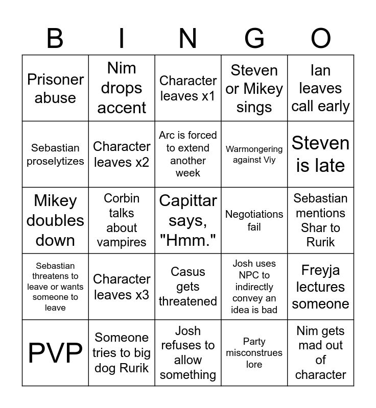 This bingo card has a free space and 29 words: PVP, Casus gets blamed, Corbin talks about vampires, Corbin attempts to physically fight someone, Prisoner abuse, Character leaves x1, Character leaves x2, Character leaves x3, Negotiations fail, Someone tries to big dog Rurik, Sebastian mentions Shar to Rurik, Nim gets mad out of character, Josh refuses to allow something, Party misconstrues lore, Steven is late, Unnecessary skeletons, Casus gets threatened, Sebastian threatens to leave or wants someone to leave, Ian leaves call early, Mikey doubles down, Josh uses NPC to indirectly convey an idea is bad, Party picks fight with paladins, Warmongering against Viy, Sebastian proselytizes, Steven or Mikey sings, Nim drops accent, Freyja lectures someone, Arc is forced to extend another week and Someone complains about Viy out of characters.