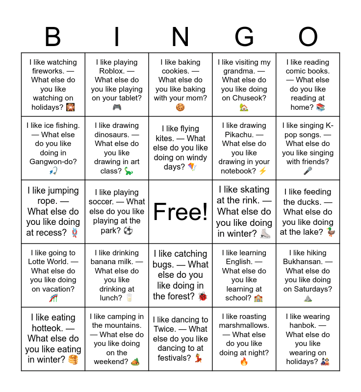 This bingo card has a free space and 33 words: I like mango bingsu. โ What else do you like eating in summer? ๐ง, I like tteokbokki. โ What else do you like eating after school? ๐ถ๏ธ, I like playing soccer. โ What else do you like playing at the park? โฝ, I like watching Pororo. โ What else do you like watching on TV? ๐ง, I like going to Lotte World. โ What else do you like doing on vacation? ๐ข, I like drawing dinosaurs. โ What else do you like drawing in art class? ๐ฆ, I like reading comic books. โ What else do you like reading at home? ๐, I like eating hotteok. โ What else do you like eating in winter? ๐ฅ, I like playing Roblox. โ What else do you like playing on your tablet? ๐ฎ, I like swimming at the beach. โ What else do you like doing in summer? ๐๏ธ, I like flying kites. โ What else do you like doing on windy days? ๐ช, I like baking cookies. โ What else do you like baking with your mom? ๐ช, I like listening to NewJeans. โ What else do you like listening to at home? ๐ต, I like building Legos. โ What else do you like building in your room? ๐งฑ, I like skating at the rink. โ What else do you like doing in winter? โธ๏ธ, I like singing K-pop songs. โ What else do you like singing with friends? ๐ค, I like camping in the mountains. โ What else do you like doing on the weekend? ๐๏ธ, I like jumping rope. โ What else do you like doing at recess? ๐ชข, I like drinking banana milk. โ What else do you like drinking at lunch? ๐ฅ, I like learning English. โ What else do you like learning at school? ๐ซ, I like catching bugs. โ What else do you like doing in the forest? ๐, I like making slime. โ What else do you like making in science class? ๐งช, I like watching fireworks. โ What else do you like watching on holidays? ๐, I like feeding the ducks. โ What else do you like doing at the lake? ๐ฆ, I like dancing to Twice. โ What else do you like dancing to at festivals? ๐, I like wearing hanbok. โ What else do you like wearing on holidays? ๐, I like visiting my grandma. โ What else do you like doing on Chuseok? ๐ก, I like drawing Pikachu. โ What else do you like drawing in your notebook? โก, I like ice fishing. โ What else do you like doing in Gangwon-do? ๐ฃ, I like hiking Bukhansan. โ What else do you like doing on Saturdays? โฐ๏ธ, I like playing janggu. โ What else do you like playing in music class? ๐ฅ, I like roasting marshmallows. โ What else do you like doing at night? ๐ฅ and I like sliding on the ice. โ What else do you like doing at the playground? ๐ท.