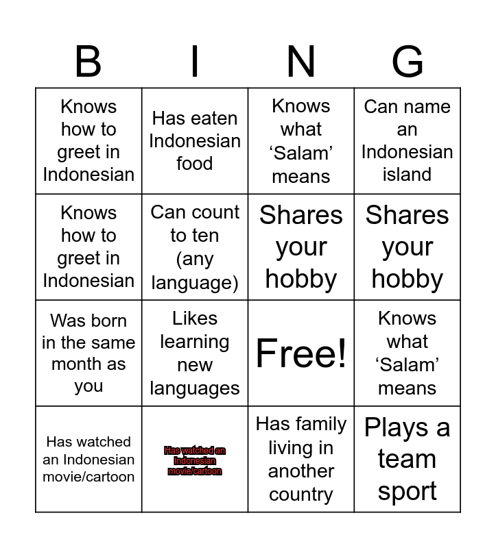 This bingo card has 22 words: Has watched an Indonesian movie/cartoon, Loves spicy food 📚, Has eaten Indonesian food, Can locate Indonesia on a map, Can count to ten (any language), Shares your hobby, Knows how to greet in Indonesian, Knows what ‘Salam’ means, Free!, Plays a team sport, Was born in the same month as you, Can name an Indonesian island, Has a pet, Has a favourite animal, Has family living in another country, Likes learning new languages, Knows what ‘Salam’ means, Has watched an Indonesian movie/cartoon, Likes learning new languages, Knows how to greet in Indonesian, Shares your hobby and Has a favourite animal.