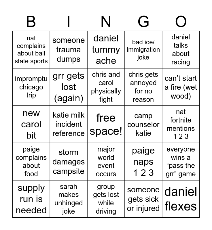 This bingo card has a free space and 24 words: storm damages campsite, sarah makes unhinged joke, chris and carol physically fight, supply run is needed, daniel talks about racing, nat complains about ball state sports, impromptu chicago trip, someone trauma dumps, camp counselor katie, major world event occurs, chris gets annoyed for no reason, new carol bit, paige naps 1 2 3, everyone wins a “pass the grr” game, grr gets lost (again), someone gets sick or injured, nat fortnite mentions 1 2 3, daniel tummy ache, can’t start a fire (wet wood), katie milk incident reference, daniel flexes, paige complains about food, bad ice/ immigration joke and group gets lost while driving.