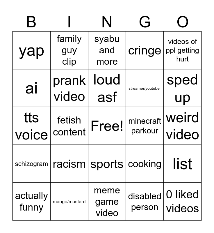 This bingo card has a free space and 24 words: racism, mango/mustard, loud asf, actually funny, videos of ppl getting hurt, yap, ai, family guy clip, minecraft parkour, sports, streamer/youtuber, tts voice, cooking, list, prank video, disabled person, weird video, syabu and more, sped up, fetish content, 0 liked videos, schizogram, cringe and meme game video.