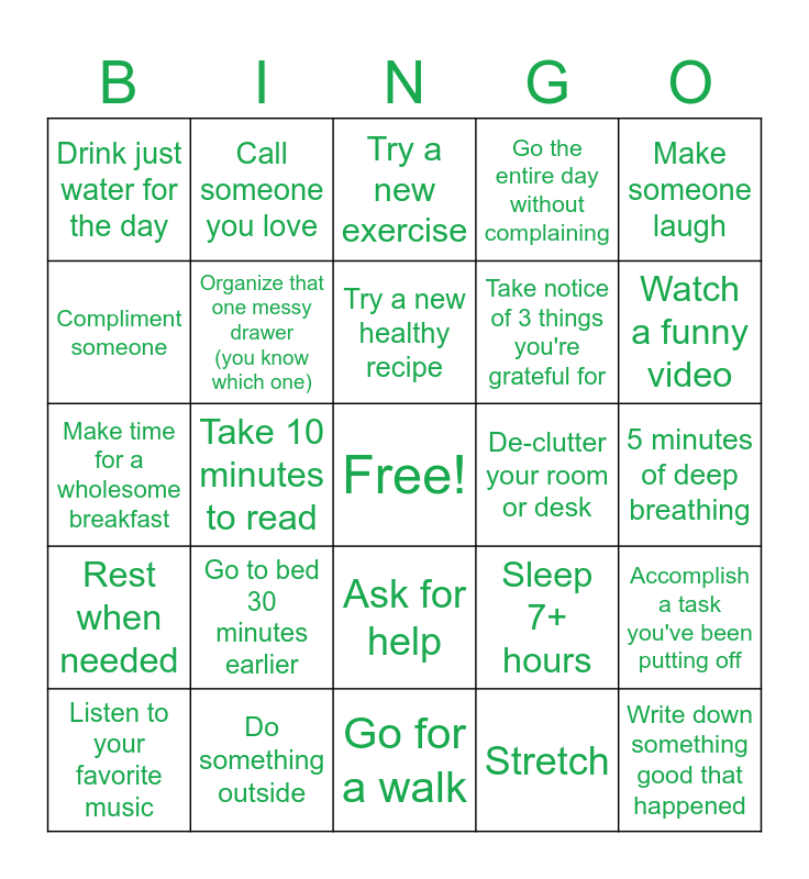 This bingo card has a free space and 24 words: Go to bed 30 minutes earlier, Do something outside, Try a new healthy recipe, Listen to your favorite music, Make someone laugh, Drink just water for the day, Compliment someone, Call someone you love, De-clutter your room or desk, Ask for help, Take notice of 3 things you're grateful for, Make time for a wholesome breakfast, Sleep 7+ hours, Accomplish a task you've been putting off, Organize that one messy drawer (you know which one), Stretch, 5 minutes of deep breathing, Try a new exercise, Watch a funny video, Take 10 minutes to read, Write down something good that happened, Rest when needed, Go the entire day without complaining and Go for a walk.