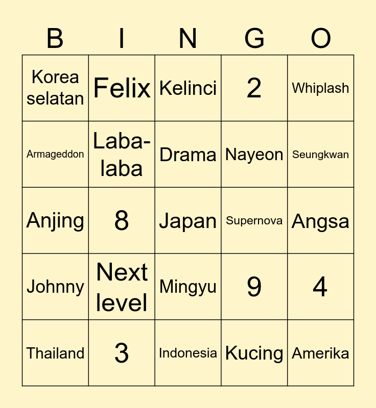 This bingo card has 25 words: Johnny, 3, Japan, Kucing, Whiplash, Korea selatan, Felix, Kelinci, Supernova, 4, Armageddon, Laba-laba, Indonesia, 9, Seungkwan, Thailand, 8, Drama, Nayeon, Angsa, Anjing, Next level, Mingyu, 2 and Amerika.