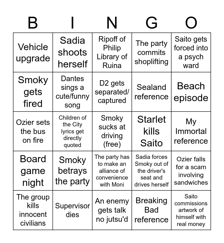 This bingo card has a free space and 24 words: Smoky betrays the party, Supervisor dies, D2 gets separated/ captured, The group kills innocent civilians, Saito gets forced into a psych ward, Vehicle upgrade, Smoky gets fired, Sadia shoots herself, Starlet kills Saito, The party has to make an alliance of convenience with Moni, Sealand reference, Ozier sets the bus on fire, Sadia forces Smoky out of the driver's seat and drives herself, Ozier falls for a scam involving sandwiches, Dantes sings a cute/funny song, Breaking Bad reference, My Immortal reference, Ripoff of Philip Library of Ruina, Beach episode, Children of the City lyrics get directly quoted, Saito commissions artwork of himself with real money, Board game night, The party commits shoplifting and An enemy gets talk no jutsu'd.