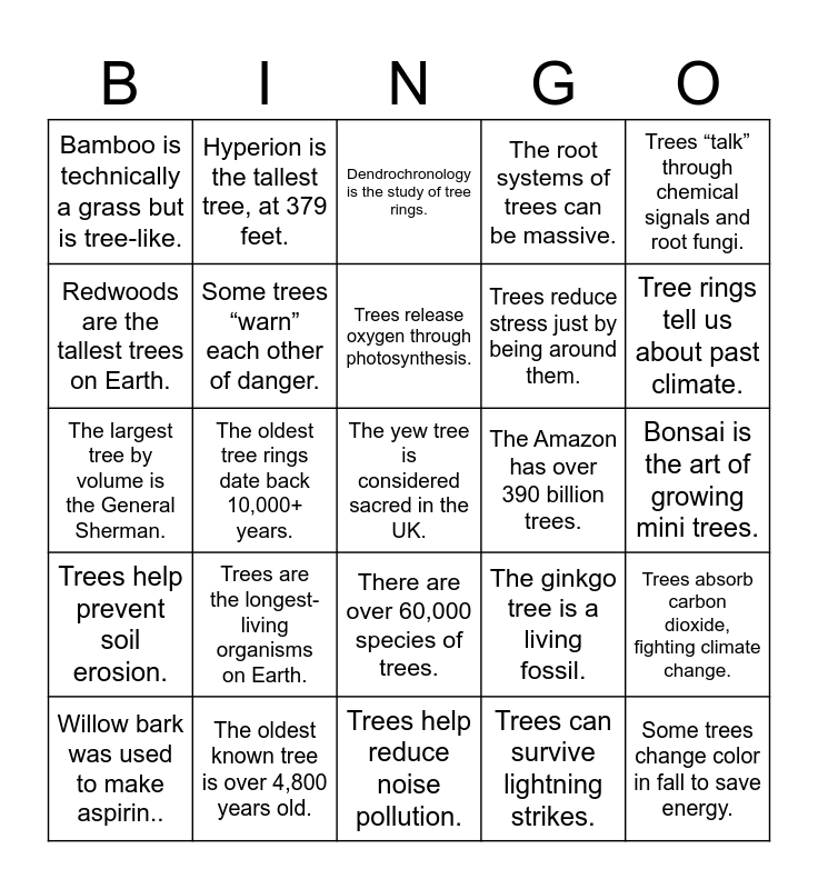 This bingo card has a free space and 24 words: Trees are the longest-living organisms on Earth., The oldest known tree is over 4,800 years old., Trees release oxygen through photosynthesis., Willow bark was used to make aspirin.., Trees “talk” through chemical signals and root fungi., Bamboo is technically a grass but is tree-like., Redwoods are the tallest trees on Earth., Hyperion is the tallest tree, at 379 feet., The Amazon has over 390 billion trees., There are over 60,000 species of trees., Trees reduce stress just by being around them., The largest tree by volume is the General Sherman., The ginkgo tree is a living fossil., Trees absorb carbon dioxide, fighting climate change., Some trees “warn” each other of danger., Trees can survive lightning strikes., Bonsai is the art of growing mini trees., Dendrochronology is the study of tree rings., Tree rings tell us about past climate., The oldest tree rings date back 10,000+ years., Some trees change color in fall to save energy., Trees help prevent soil erosion., The root systems of trees can be massive. and Trees help reduce noise pollution..