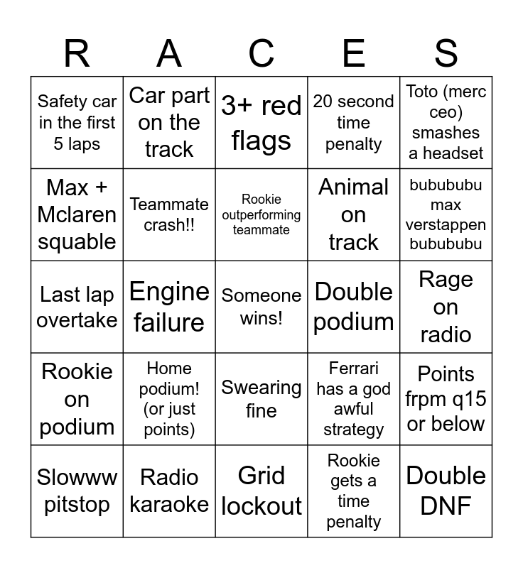 This bingo card has a free space and 24 words: Home podium! (or just points), Radio karaoke, Rookie outperforming teammate, Slowww pitstop, Toto (merc ceo) smashes a headset, Safety car in the first 5 laps, Max + Mclaren squable, Car part on the track, Double podium, Swearing fine, Animal on track, Last lap overtake, Ferrari has a god awful strategy, Points frpm q15 or below, Teammate crash!!, Rookie gets a time penalty, Rage on radio, 3+ red flags, bubububu max verstappen bubububu, Engine failure, Double DNF, Rookie on podium, 20 second time penalty and Grid lockout.