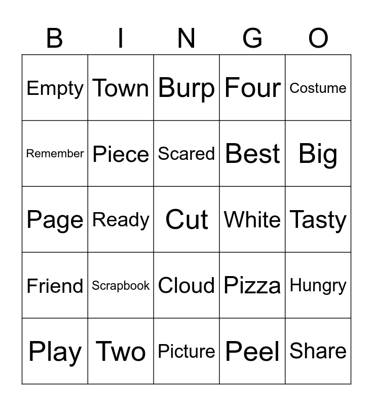 This bingo card has 25 words: Scrapbook, Picture, Scared, Play, Costume, Empty, Remember, Town, White, Cloud, Best, Page, Pizza, Hungry, Piece, Share, Tasty, Burp, Big, Ready, Cut, Two, Friend, Four and Peel.