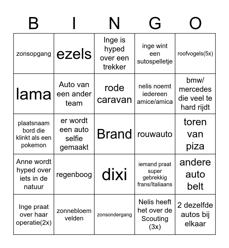 This bingo card has a free space and 34 words: Koen praat over zeilen(5x), Nelis heeft het over de Scouting (3x), Walter gaat hard op Jebroer, Koen praat over de Tour de France, Anne wordt hyped over iets in de natuur, Auto van een ander team, roofvogels(5x), Inge praat over haar operatie(2x), ezels, auto uit Montenegro, rode caravan, Inge is hyped over een trekker, zeilboot, Brandweer, rouwauto, bmw/ mercedes die veel te hard rijdt, zonnebloem velden, plaatsnaam bord die klinkt als een pokemon, regenboog, iemand praat super gebrekkig frans/Italiaans, dixi, slapende bijrijder in een andere auto, zonsopgang, toren van piza, zonsondergang, 2 dezelfde autos bij elkaar, inge wint een sutospelletje, walt zegt ``en maar rijden``, nelis noemt iedereen amice/amica, lama, italiaanse vlag, er wordt een auto selfie gemaakt, andere auto belt and Nelis gaat hard op gecancelde artiest.