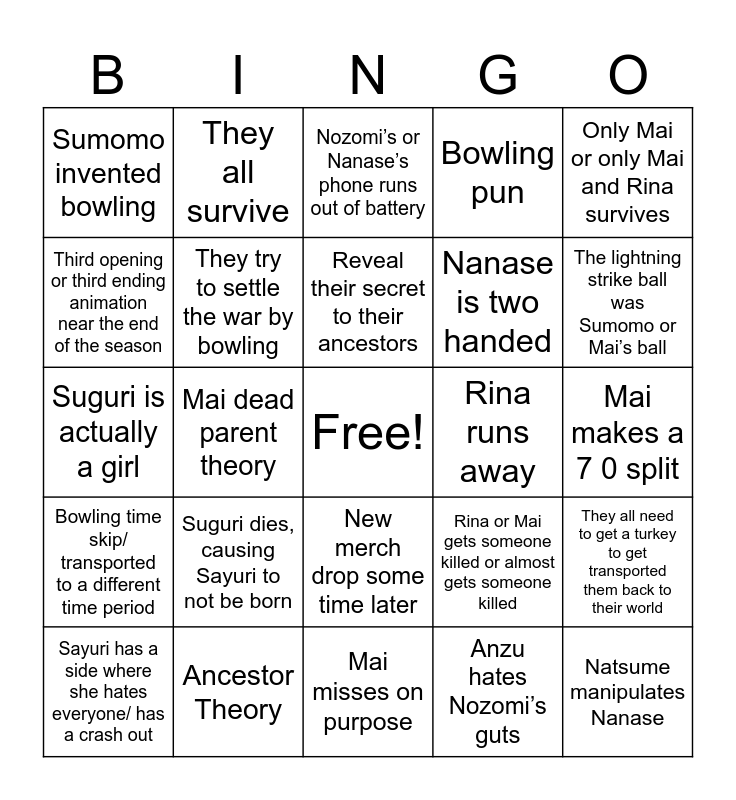 This bingo card has a free space and 24 words: Suguri dies, causing Sayuri to not be born, Ancestor Theory, Reveal their secret to their ancestors, Sayuri has a side where she hates everyone/ has a crash out, Only Mai or only Mai and Rina survives, Sumomo invented bowling, Third opening or third ending animation near the end of the season, They all survive, Rina runs away, New merch drop some time later, Nanase is two handed, Suguri is actually a girl, Rina or Mai gets someone killed or almost gets someone killed, They all need to get a turkey to get transported them back to their world, They try to settle the war by bowling, Anzu hates Nozomi’s guts, Mai makes a 7 0 split, Nozomi’s or Nanase’s phone runs out of battery, The lightning strike ball was Sumomo or Mai’s ball, Mai dead parent theory, Natsume manipulates Nanase, Bowling time skip/ transported to a different time period, Bowling pun and Mai misses on purpose.