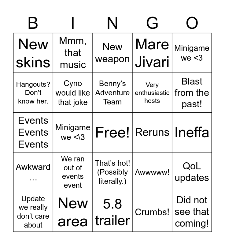 This bingo card has a free space and 24 words: We ran out of events event, New area, Benny’s Adventure Team, Update we really don’t care about, Minigame we <3, New skins, Hangouts? Don’t know her., Mmm, that music, Reruns, That’s hot! (Possibly literally.), Very enthusiastic hosts, Events Events Events, Awwwww!, QoL updates, Cyno would like that joke, Crumbs!, Ineffa, New weapon, Blast from the past!, Minigame we <\3, Did not see that coming!, Awkward …, Mare Jivari and 5.8 trailer.