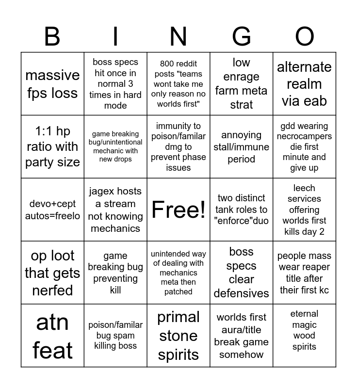 This bingo card has a free space and 24 words: game breaking bug preventing kill, poison/familar bug spam killing boss, immunity to poison/familar dmg to prevent phase issues, atn feat, alternate realm via eab, massive fps loss, 1:1 hp ratio with party size, boss specs hit once in normal 3 times in hard mode, two distinct tank roles to "enforce"duo, unintended way of dealing with mechanics meta then patched, annoying stall/immune period, devo+cept autos=freelo, boss specs clear defensives, people mass wear reaper title after their first kc, game breaking bug/unintentional mechanic with new drops, worlds first aura/title break game somehow, leech services offering worlds first kills day 2, 800 reddit posts "teams wont take me only reason no worlds first", gdd wearing necrocampers die first minute and give up, jagex hosts a stream not knowing mechanics, eternal magic wood spirits, op loot that gets nerfed, low enrage farm meta strat and primal stone spirits.