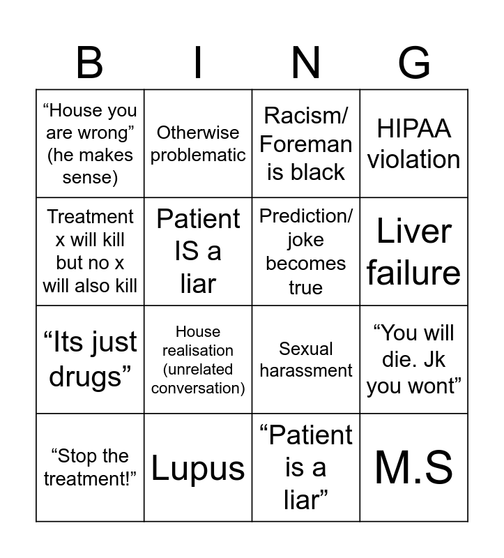 This bingo card has 16 words: Lupus, “You will die. Jk you wont”, Racism/ Foreman is black, “House you are wrong” (he makes sense), “Its just drugs”, Otherwise problematic, Sexual harassment, “Patient is a liar”, Treatment x will kill but no x will also kill, Patient IS a liar, “Stop the treatment!”, HIPAA violation, House realisation (unrelated conversation), Liver failure, Prediction/ joke becomes true and M.S.