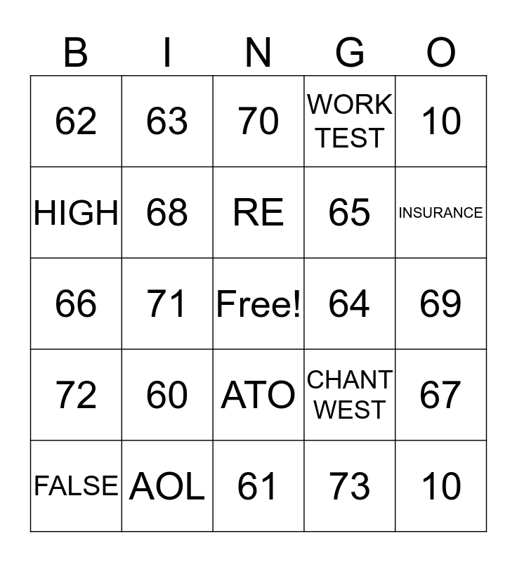 This bingo card has a free space and 25 words: 60, 61, RE, FALSE, 10, 62, HIGH, 63, 64, ATO, 65, 66, CHANT WEST, 67, 68, BENEFICIARY, 69, 70, INSURANCE, 71, 10, AOL, 72, WORK TEST and 73.