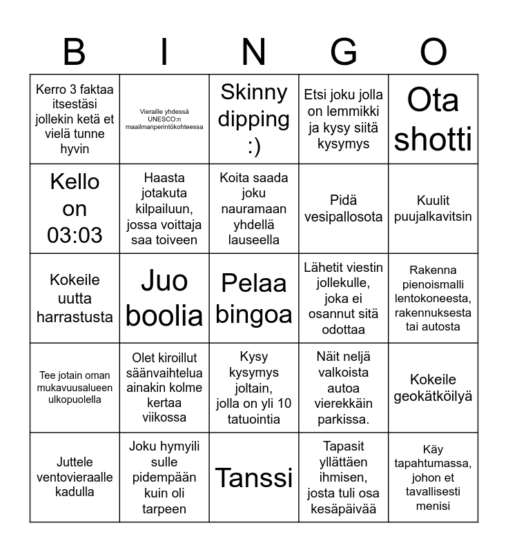 This bingo card has a free space and 24 words: Olet kiroillut säänvaihtelua ainakin kolme kertaa viikossa, Joku hymyili sulle pidempään kuin oli tarpeen, Koita saada joku nauramaan yhdellä lauseella, Juttele ventovieraalle kadulla, Ota shotti, Kerro 3 faktaa itsestäsi jollekin ketä et vielä tunne hyvin, Kello on 03:03, Vieraille yhdessä UNESCO:n maailmanperintökohteessa, Lähetit viestin jollekulle, joka ei osannut sitä odottaa, Kysy kysymys joltain, jolla on yli 10 tatuointia, Pidä vesipallosota, Kokeile uutta harrastusta, Näit neljä valkoista autoa vierekkäin parkissa., Kokeile geokätköilyä, Haasta jotakuta kilpailuun, jossa voittaja saa toiveen, Tapasit yllättäen ihmisen, josta tuli osa kesäpäivää, Rakenna pienoismalli lentokoneesta, rakennuksesta tai autosta, Skinny dipping :), Kuulit puujalkavitsin, Juo boolia, Käy tapahtumassa, johon et tavallisesti menisi, Tee jotain oman mukavuusalueen ulkopuolella, Etsi joku jolla on lemmikki ja kysy siitä kysymys and Tanssi.