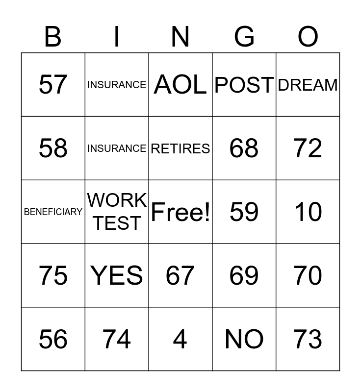 This bingo card has a free space and 25 words: YES, 4, RETIRES, 56, DREAM, 57, 58, INSURANCE, 59, 67, 68, BENEFICIARY, 69, 70, INSURANCE, 71, 10, AOL, 72, WORK TEST, 73, 74, 75, POST and NO.