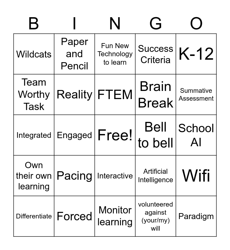 This bingo card has a free space and 39 words: Rigor, Formative Assessment, Attendance, Reality, Differentiate, Interactive, FTEM, Bears, K-12, Own their own learning, Engaged, Success Criteria, Paradigm, School AI, Bell to bell, Pacing, Fun, Wildcats, Learning Target, Artificial Intelligence, Team Worthy Task, Monitor learning, Brain Break, Summative Assessment, Social Emotional Learning, Restorative Practices, Fight or Flight, Culture, Collaborate, Paper and Pencil, Screens, Personalized, Fun New Technology to learn, Forced, volunteered against (your/my) will, Screams, Wifi, Integrated and Canvas.