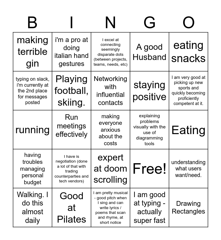 This bingo card has 25 words: I have is negotiation (done a lot of that with trading counterparties and tech vendors), I am pretty musical - good pitch when I sing and can write lyrics / poems that scan and rhyme, at short notice, Networking with influential contacts, Walking. I do this almost daily, eating snacks, making terrible gin, typing on slack, i'm currently at the 2nd place for messages posted, i'm a pro at doing italian hand gestures, explaining problems visually with the use of diagramming tools, expert at doom scrolling, staying positive, running, Free!, understanding what users want/need., Playing football, skiing., Drawing Rectangles, Eating, I excel at connecting seemingly disparate dots (between projects, teams, needs, etc), I am very good at picking up new sports and quickly becoming proficiently competent at it., Run meetings effectively, making everyone anxious about the costs, Good at Pilates, having troubles managing personal budget, A good Husband and I am good at typing - actually super fast.