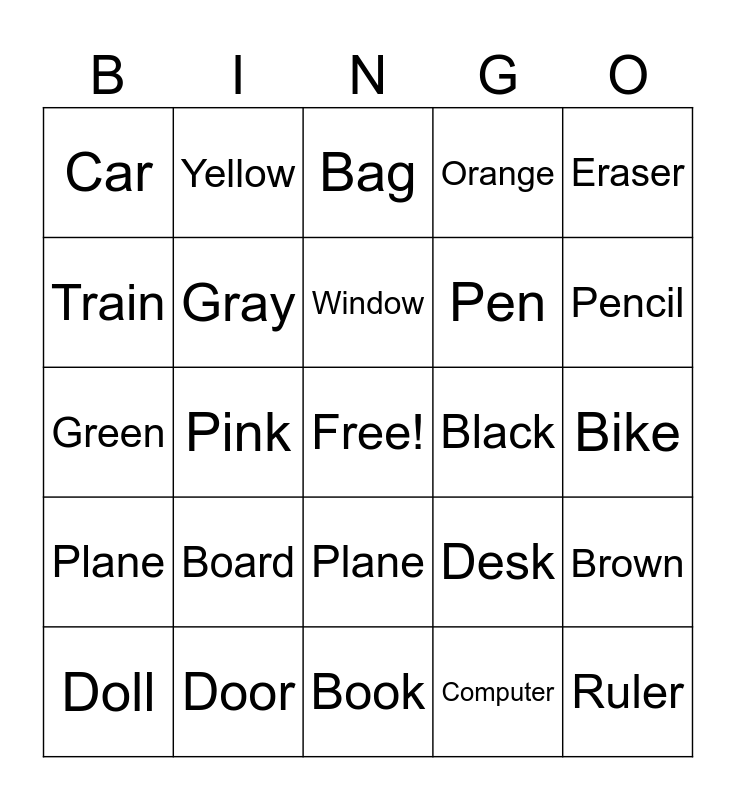 This bingo card has a free space and 24 words: Board, Door, Window, Doll, Eraser, Car, Train, Yellow, Black, Plane, Pen, Green, Desk, Brown, Gray, Computer, Bike, Bag, Pencil, Pink, Ruler, Plane, Orange and Book.