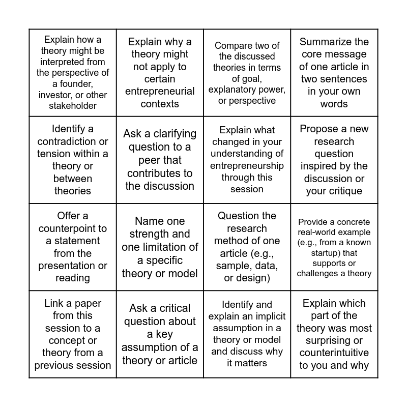 This bingo card has 16 words: Ask a critical question about a key assumption of a theory or article, Provide a concrete real-world example (e.g., from a known startup) that supports or challenges a theory, Compare two of the discussed theories in terms of goal, explanatory power, or perspective, Explain how a theory might be interpreted from the perspective of a founder, investor, or other stakeholder, Offer a counterpoint to a statement from the presentation or reading, Explain why a theory might not apply to certain entrepreneurial contexts, Question the research method of one article (e.g., sample, data, or design), Identify and explain an implicit assumption in a theory or model and discuss why it matters, Identify a contradiction or tension within a theory or between theories, Ask a clarifying question to a peer that contributes to the discussion, Link a paper from this session to a concept or theory from a previous session, Summarize the core message of one article in two sentences in your own words, Name one strength and one limitation of a specific theory or model, Propose a new research question inspired by the discussion or your critique, Explain what changed in your understanding of entrepreneurship through this session and Explain which part of the theory was most surprising or counterintuitive to you and why.